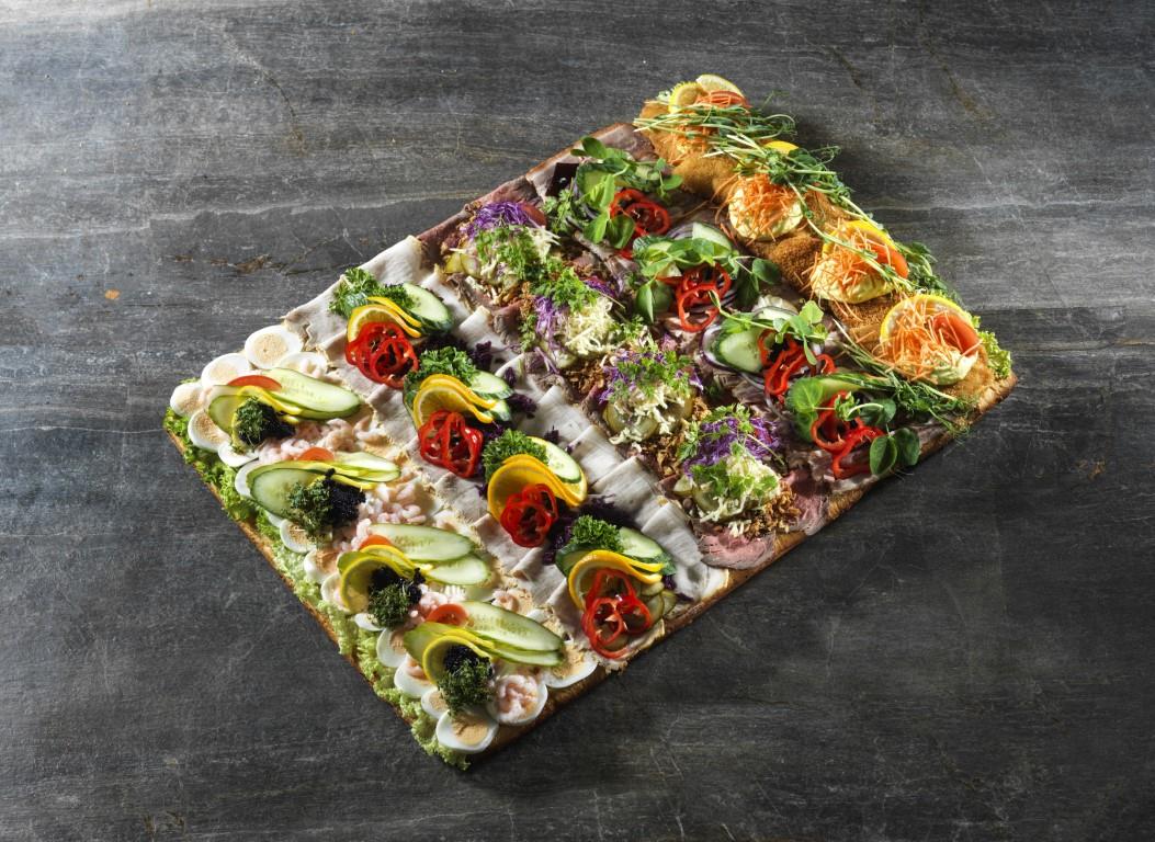 Flot pyntet på lyst brød med kerner med 5 slags pålæg.